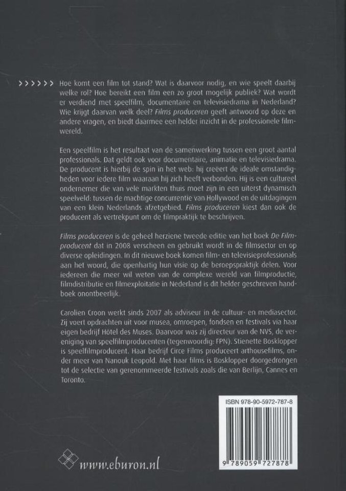 Hoe komt een film tot stand? Wat is daarvoor nodig, en wie speelt daarbij welke rol? Hoe bereikt een film een zo groot mogelijk publiek? Wat wordt er verdiend met speelfilm, documentaire en televisiedrama in Nederland? Wie krijgt daarvan welk deel? 'Films produceren' geeft antwoord op deze en andere vragen, en biedt daarmee een helder inzicht in de professionele filmwereld.