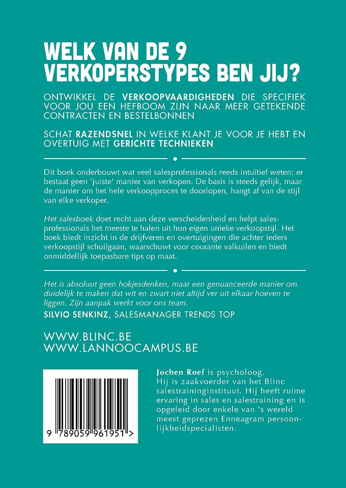 Het salesboek doet recht aan deze verscheidenheid en helpt salesprofessionals het meeste te halen uit hun eigen unieke verkoopstijl. Het boek biedt inzicht in de drijfveren en overtuigingen die achter ieders verkoopstijl schuilgaan, waarschuwt voor courante valkuilen en biedt onmiddellijk toepasbare tips op maat.
