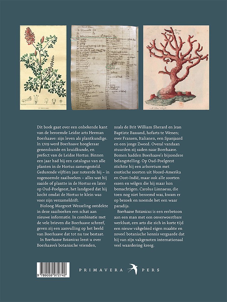 Bioloog Margreet Wesseling ontdekte in deze zaaiboeken een schat aan nieuwe informatie die zij combineerde met gegevens uit de vele brieven die Boerhaave schreef. In Boerhaave Botanicus presenteert de auteur een aanvulling op het beeld dat wij van de arts Boerhaave hebben. U leest over Boerhaave’s botanische vrienden, zoals de Brit William Sherard en Jean Baptiste Bassand, hofarts te Wenen; over Fransen, Italianen, een Spanjaard en een jonge Zweed. Overal vandaan stuurde dit internationale gezelschap zaden naar Boerhaave.