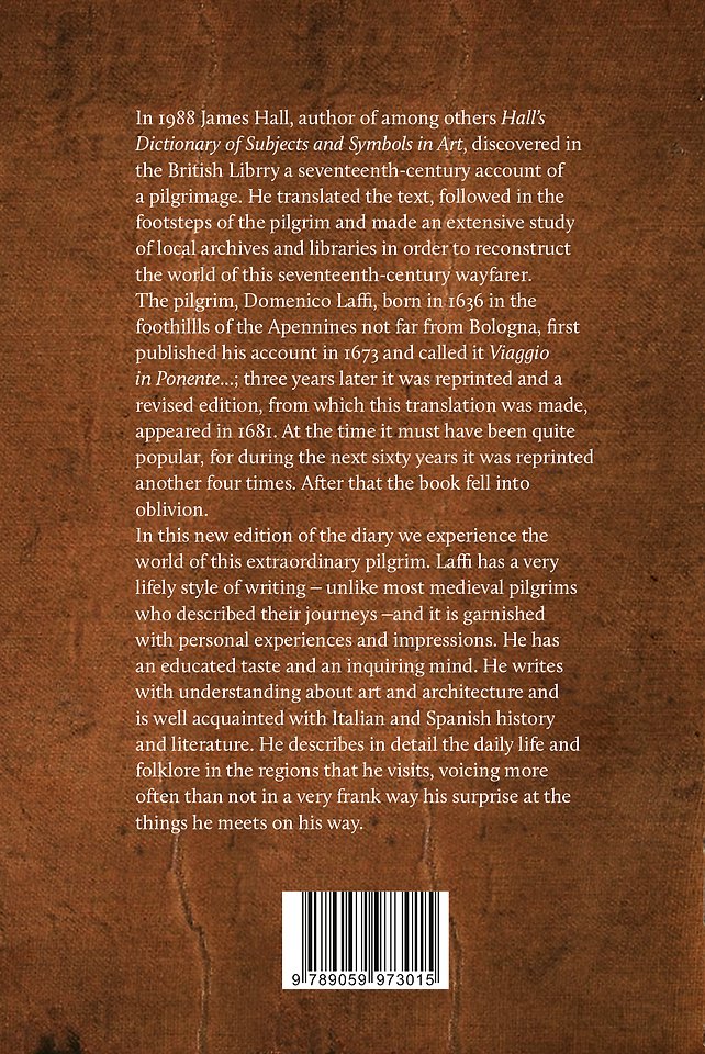 In this new edition of the diary we experience the world of this extraordinary pilgrim. Laffi has a very lifely style of writing – unlike most medieval pilgrims who described their journeys –and it is garnished with personal experiences and impressions. He has an educated taste and an inquiring mind. He writes with understanding about art and architecture and is well acquainted with Italian and Spanish history and literature. He describes in detail the daily life and folklore in the regions that he visits, voicing more often than not in a very frank way his surprise at the things he meets on his way.