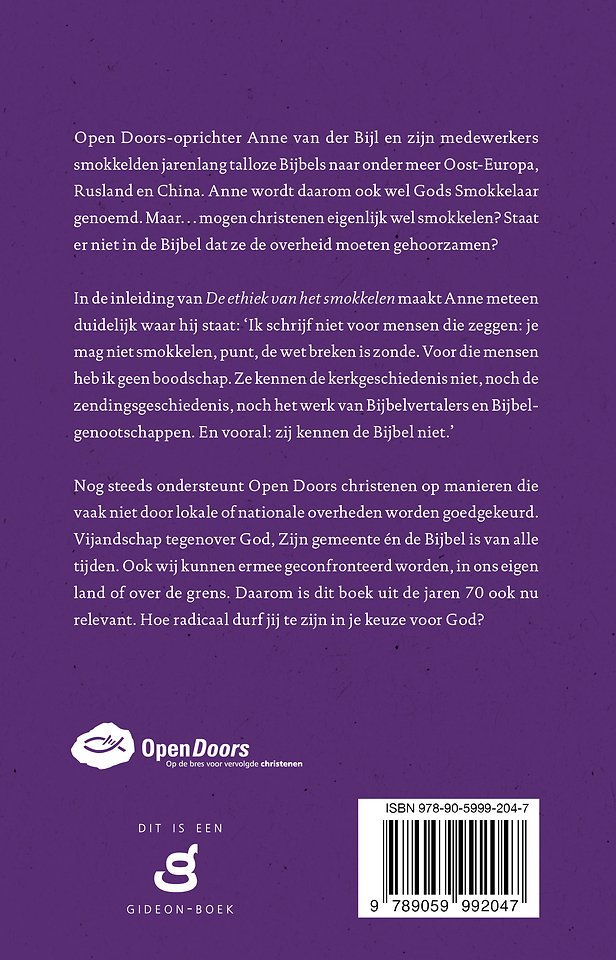 Deze heruitgave van De ethiek van het smokkelen is de eerste van een serie van 7 heruitgaven van boeken van Anne van der Bijl die wij samen met Open Doors realiseren. De andere titels zijn: De strijd om Afrika, En God bedacht Zich, Als je leven je lief is!, Tijd voor helden, Bouwen in een verscheurde wereld en De roeping.