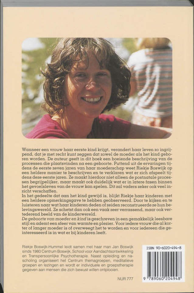 Wanneer een vrouw haar eerste kind krijgt, verandert haar leven zo ingrijpend, dat je met recht kunt zeggen dat zowel de moeder als het kind wordt geboren. De auteur geeft in dit boek een boeiende beschrijving van de processen die plaatsvinden na een geboorte. Puttend uit de ervaringen tijdens de eerste zeven maanden van haar moederschap weet Riekje Boswijk op een heldere manier te beschrijven en te verklaren wat er zich afspeelt tijdens deze eerste jaren. Ze maakt hierdoor niet alleen de postnatale processen begrijpelijker, maar maakt ook duidelijk wat er in latere fasen binnen het gevoelsleven van de vrouw kan spelen. Dit zal vaders zeker ook veel inzicht verschaffen. Ze schetst ook een vaak even verrassend als vertederend beeld van de kinderwereld.