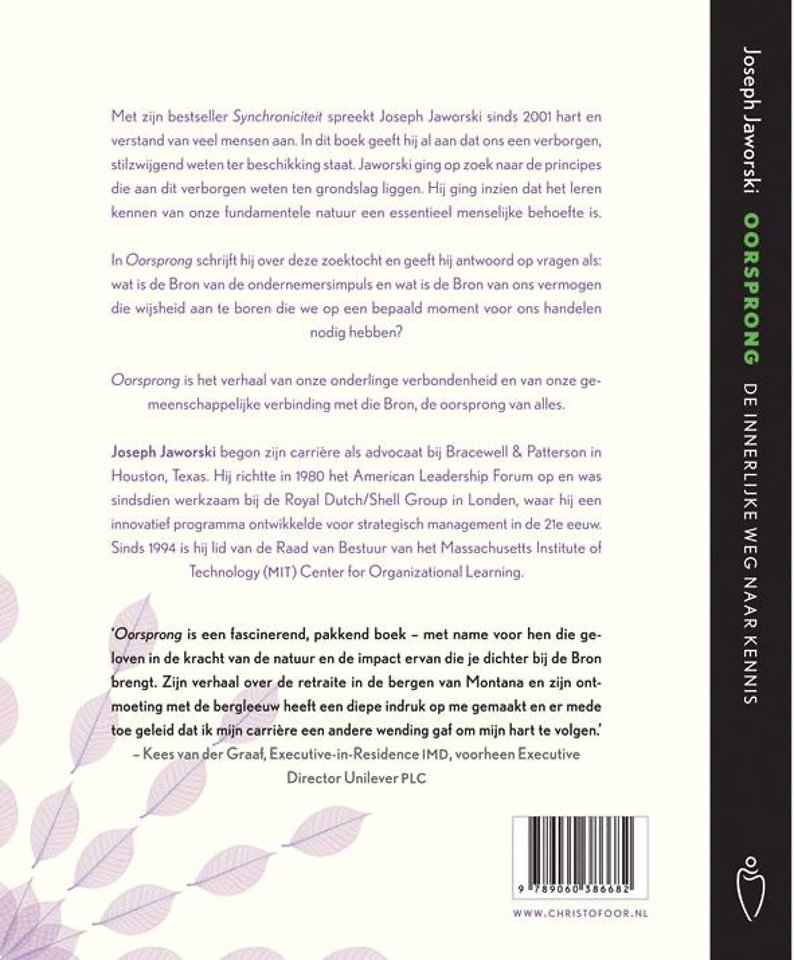In 'Oorsprong' schrijft hij over deze zoektocht en geeft hij antwoord op vragen als: wat is de bron van de ondernemersimpuls en wat is de bron van ons vermogen die wijsheid aan te boren die we op een bepaald moment voor ons handelen nodig hebben? 'Oorsprong' is het verhaal van onze onderlinge verbondenheid en van onze gemeenschappelijke verbinding.