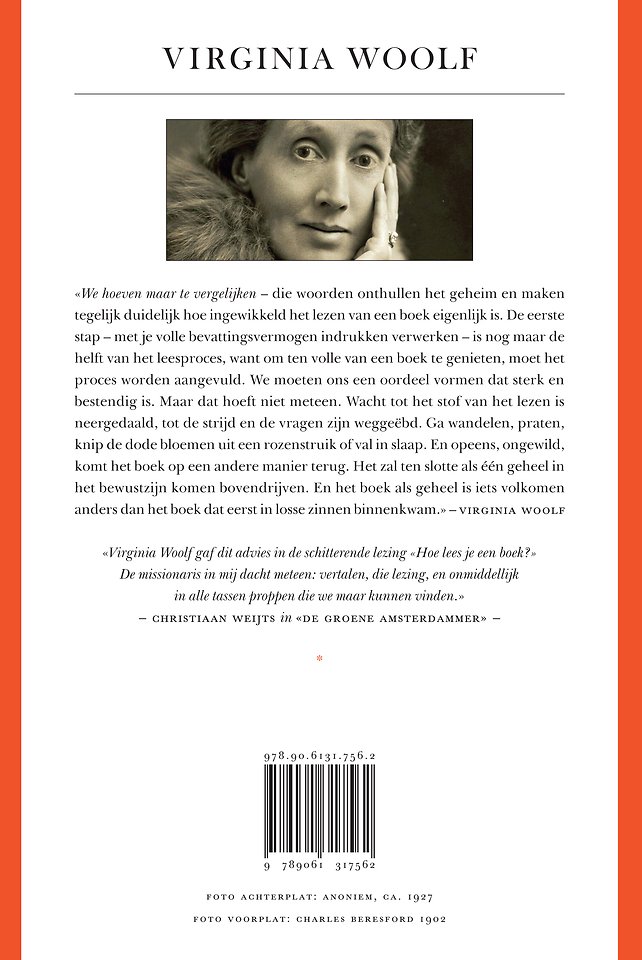 Niet eerder verscheen in Nederland een selectie van Woolfs alom bejubelde essays over literatuur, waarin de grote thema’s van haar leven en werk voortdurend herkenbaar zijn: de manier waarop kunst het leven kan veranderen, de ongrijpbaarheid van het menselijk karakter, de problemen waarmee vrouwelijke schrijvers en intellectuelen moeten worstelen in een door mannen gedomineerde wereld, de verknoping van tijd en eeuwigheid in een mensenleven en de voor iedereen op elk moment uiterst belangrijke vraag: hoe lees je een boek?