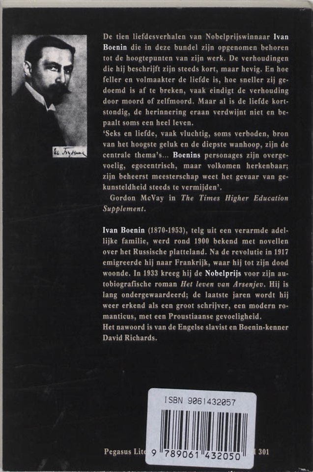 De tien liefdesverhalen van Nobelprijswinnaar Ivan Boenin die in deze bundel zijn opgenomen behoren tot de hoogtepunten van zijn werk. De verhoudingen die hij beschrijft zijn steeds kort, maar hevig. En hoe feller en volmaakter de liefde is, hoe sneller zij gedoemd is af te breken, vaak eindigt de verhouding door moord of zelfmoord. Maar al is de liefde kortstondig, de herinnering eraan verdwijnt niet en bepaalt soms een heel leven.