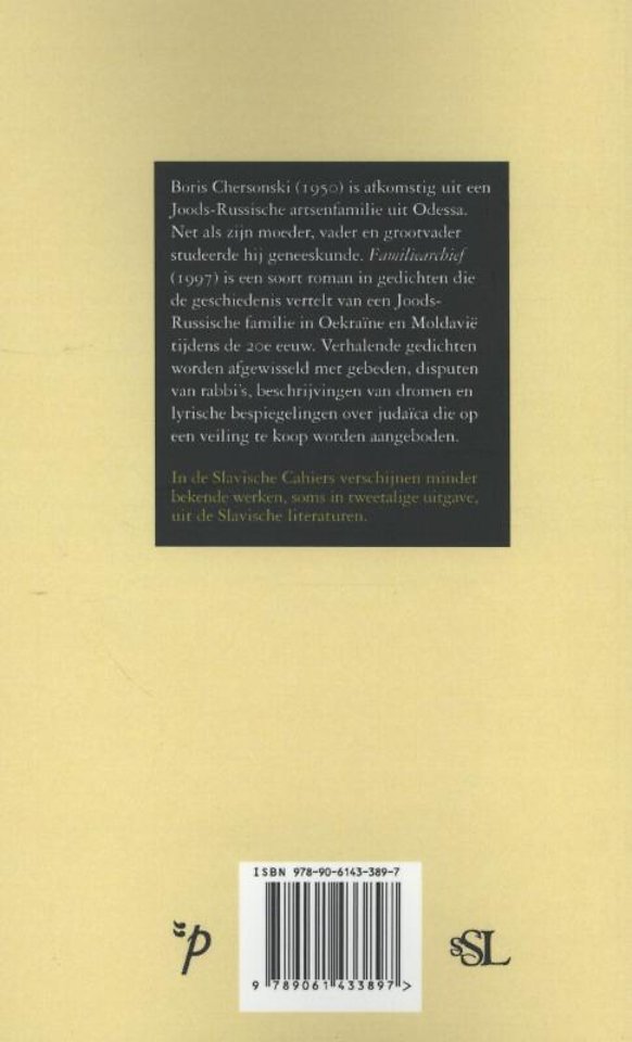 Tweetalige uitgave van Familiearchief, roman van verhalende gedichten van de Joods-Russische schrijver Boris Chersonski. Slavisch Cahier 19