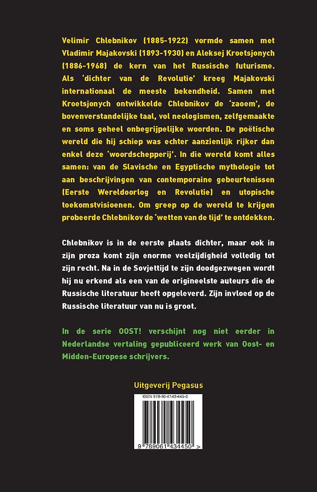 Velimir Chlebnikov (1885-1922) vormde samen met Vladimir Majakovski (1893-1930) en Aleksej Kroetsjonych (1886-1968) de kern van het Russische futurisme. Als ‘dichter van de Revolutie’ kreeg Majakovski internationaal de meeste bekendheid. Samen met Kroetsjonych ontwikkelde Chlebnikov de ‘zaoem’, de bovenverstandelijke taal, vol neologismen, zelfgemaakte en soms geheel onbegrijpelijke woorden. De poëtische wereld die hij schiep was echter aanzienlijk rijker dan enkel deze ‘woordschepperij’. In die wereld komt alles samen: van de Slavische en Egyptische mythologie tot aan beschrijvingen van contemporaine gebeurtenissen (Eerste Wereldoorlog en Revolutie) en utopische toekomstvisioenen. Om greep op de wereld te krijgen probeerde Chlebnikov de ‘wetten van de tijd’ te ontdekken.