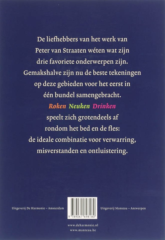 De liefhebbers van het werk van Peter van Straaten w n wat zijn drie favoriete onderwerpen zijn. Gemakshalve zijn nu de beste tekeningen op deze gebieden voor het eerst in bundel samengebracht. Roken Neuken Drinken spelt zich grotendeels af rondom het bed en de fles: de ideale combinatie voor verwarring, misverstanden en ontluistering.