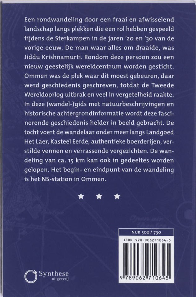 en rondwandeling door een fraai en afwisselend landschap langs plekken die een rol hebben gespeeld tijdens de Sterkampen in de jaren '20 en '30 van de vorige eeuw. De man waar alles om draaide, was Jiddu Krishnamurti. Rondom hem zou een nieuw geestelijk wereldcentrum worden gesticht. Ommen was de plek waar dit moest gebeuren, daar werd geschiedenis geschreven totdat de Tweede Wereldoorlog uitbrak en veel in vergetelheid raakte. In deze (wandel-)gids met natuurbeschrijvingen en historische achtergrondinformatie wordt deze fascinerende geschiedenis helder in beeld gebracht. De tocht voert de wandelaar onder andere langs Landgoed Het Laer, Kasteel Eerde, authentieke boerderijen, verstilde vennen en verrassende vergezichten. Het begin- én eindpunt van de wandeling is het NS-station Ommen.