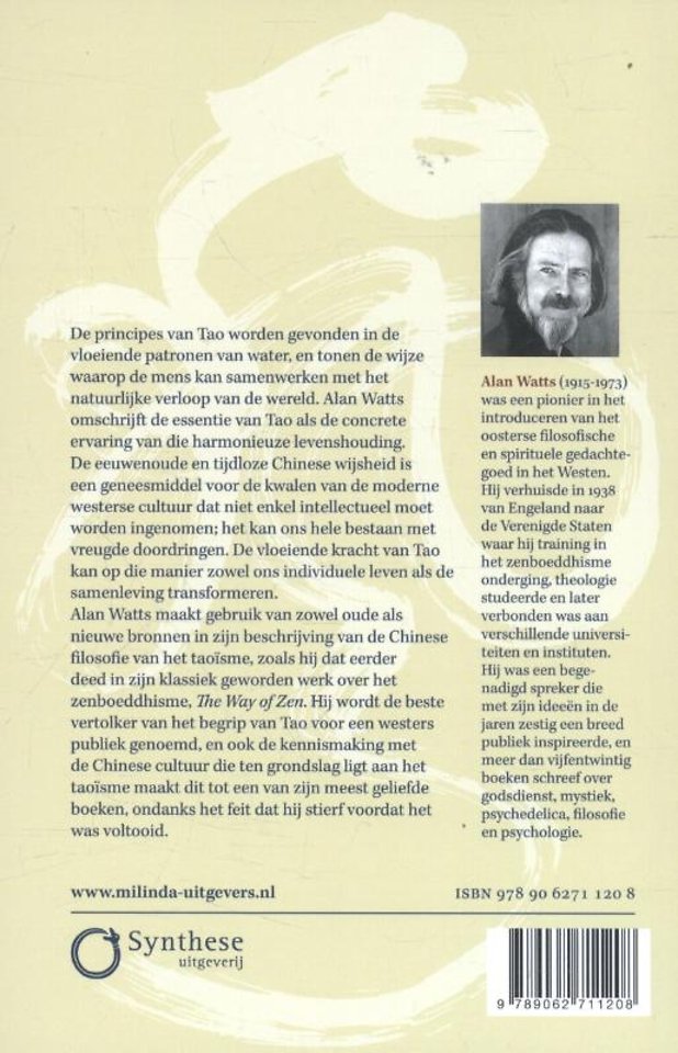 De principes van tao worden gevonden in de vloeiende patronen van water, en tonen de wijze waarop de mens kan samenwerken met het eigen verloop van de natuurlijke wereld. Alan Watts omschrijft de essentie van Tao als de concrete ervaring van die harmonieuze levenshouding. De eeuwenoude en tijdloze Chinese wijsheid is een geneesmiddel voor de kwalen van de moderne westerse cultuur dat niet enkel intellectueel moet worden opgenomen; het kan ons hele bestaan met vreugde doordringen. De vloeiende kracht van tao kan op die manier zowel ons individuele leven als de samenleving transformeren. Alan Watts maakt gebruik van zowel oude als nieuwe bronnen in zijn beschrijving van de Chinese filosofie van het taoïsme, zoals hij dat eerder deed in zijn klassiek geworden werk over het zenboeddhisme, The Way of Zen. Men heeft hem de beste vertolker van het begrip van tao voor het westerse publiek genoemd, en ook de kennismaking met de Chinese cultuur die ten grondslag ligt aan het taoïsme, maakt dit tot een van zijn meest geliefde boeken, ondanks het feit dat hij stierf voordat het was voltooid.