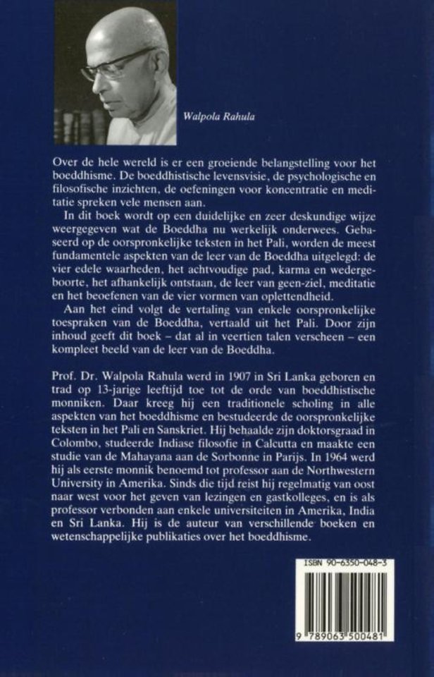 Aan het eind volgt de vertaling van enkele oorspronkelijke toespraken van de Boeddha, vertaald uit het Pali. Door zijn inhoud geeft dit boek - dat al in veertien talen verscheen - een kompleet beeld van de leer van de Boeddha.