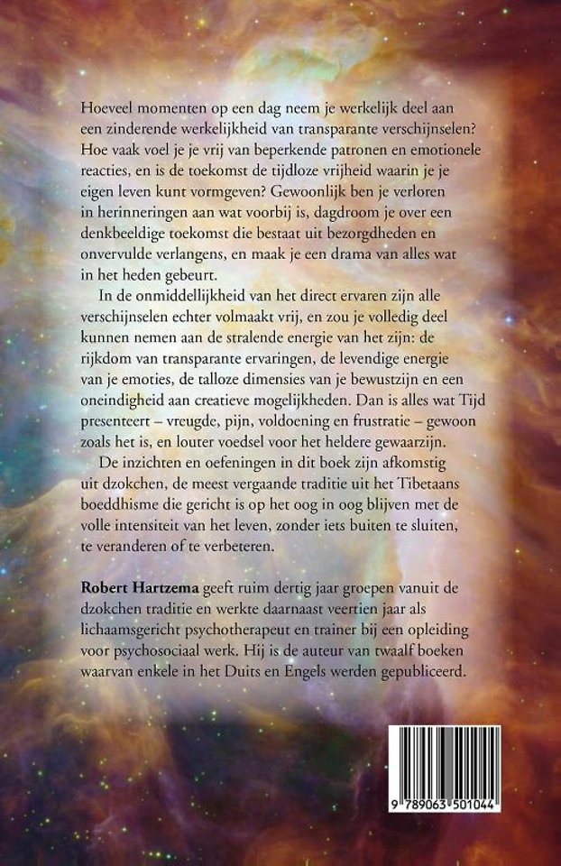 In de onmiddellijkheid van het ervaren zijn alle verschijnselen echter volmaakt vrij en kun je volledig deelnemen aan de dynamische energie van het Zijn: de rijkdom van gewaarwordingen, de vlijmscherpe helderheid van emoties, de talloze dimensies van ervaren en een oneindigheid aan mogelijkheden. Dan is alles wat Tijd presenteert – vreugde en pijn, voldoening en frustratie – louter voedsel voor helder gewaarzijn en ontstaat een volmaakte vrijheid.