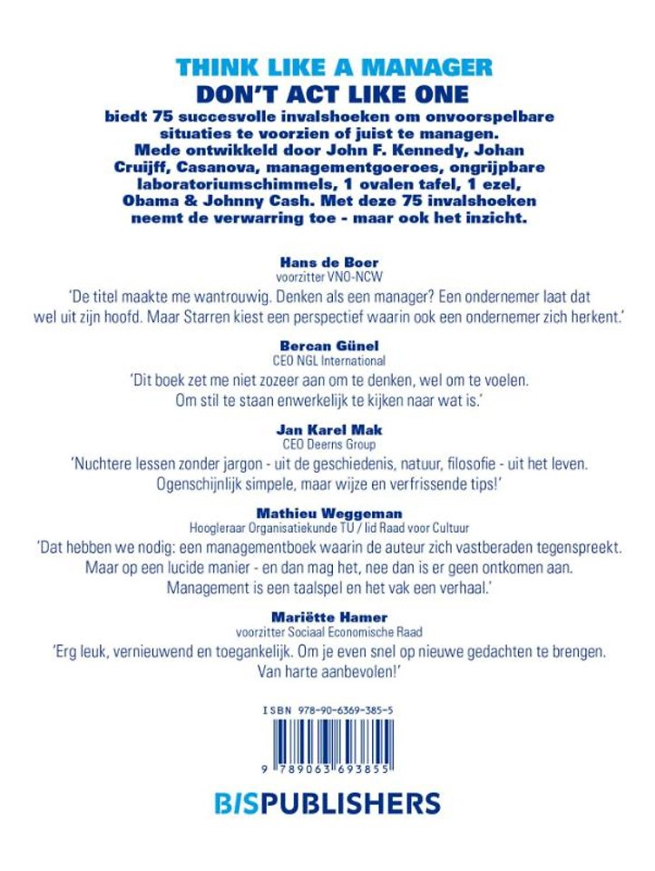 Meer over Harry StarrenIn navolging van het succesvolle 'Think like a lawyer don’t act like one' presenteren we dit boek dat, in hetzelfde formaat, 75 extreme korte en visuele managementlessen bevat. Net zoals een advocaat is ook een manager een professional waar behoorlijk wat mensen problemen mee kunnen ervaren. Keer op keer lijken de fouten die managers maken in het zelfde patroon te passen.
