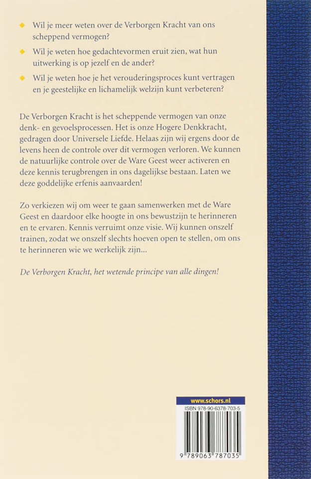 De Verborgen Kracht is het scheppende vermogen van onze denk - en gevoelsprocessen. Het is onze Hogere Denkkracht, gedragen door Universele Liefde. Helaas zijn wij ergens door de levens heen de controle over dit vermogen verloren. We kunnen de natuurlijke controle over de Ware Geest weer activeren en deze kennis terugbrengen in ons dagelijkse bestaan. Laten we deze geddelijke erfenis anvaarden!