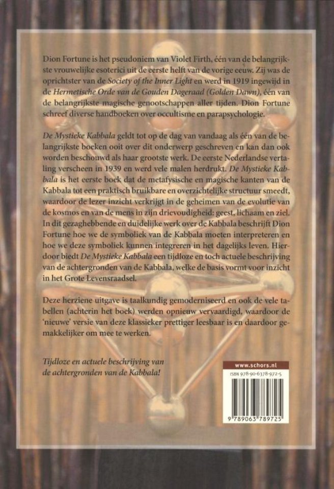 Dion Fortune is het pseudoniem van Violet Firth, één van de belangrijkste vrouwelijke esoterici uit de eerste helft van de vorige eeuw. Zij was de oprichtster van de 'Society of the Inner Light' en werd in 1919 ingewijd in de 'Hermetische Orde van de Gouden Dageraad' (de 'Golden Dawn'), één van de belangrijkste magische genootschappen aller tijden. Dion Fortune schreef diverse handboeken over occultisme en parapsychologie. De Mystieke Kabbala geldt tot op de dag van vandaag als een der belangrijkste boeken ooit over dit onderwerp geschreven en kan dan ook worden beschouwd als haar grootste werk. De eerste Nederlandse vertaling verscheen in 1939 en werd vele malen herdrukt. De Mystieke Kabbala is het eerste boek dat de metafysische en magische kanten van de Kabbala tot een praktisch bruikbare en overzichtelijke structuur smeedt waardoor de lezer inzicht verkrijgt in de geheimen van de evolutie van de kosmos en van de mens in zijn drievoudigheid: geest, lichaam en ziel.