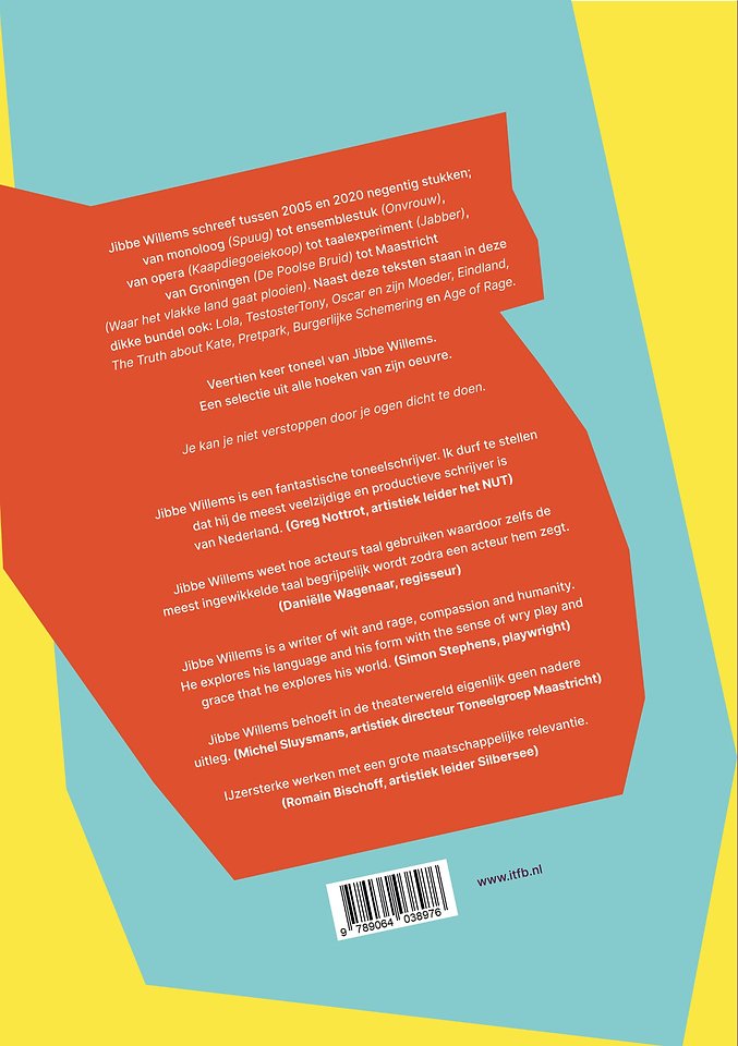 Jibbe Willems schreef tussen 2005 en 2020 negentig stukken; van monoloog (Spuug) tot ensemblestuk (Onvrouw), van opera (Kaapdiegoeiekoop) tot taalexperiment (Jabber), van Groningen (De Poolse Bruid) tot Maastricht (Waar het vlakke land gaat plooien).