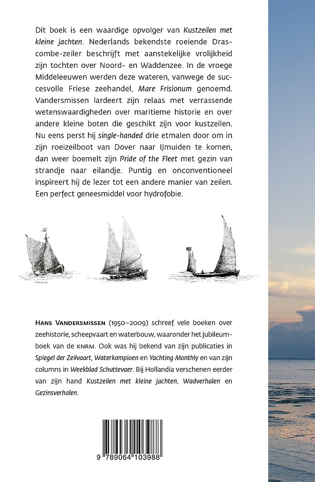 Vandersmissen lardeert zijn relaas met verrassende wetenswaardigheden over maritieme historie en over andere kleine boten die geschikt zijn voor kustzeilen. Nu eens perst hij single-handed drie etmalen door om in zijn roeizeilboot van Dover naar IJmuiden te komen, dan weer boemelt zijn Pride of the Fleet met gezin van strandje naar eilandje. Puntig en onconventioneel inspireert hij de zeiler tot een andere manier van zeilen. Een perfect geneesmiddel voor hydrofobie.