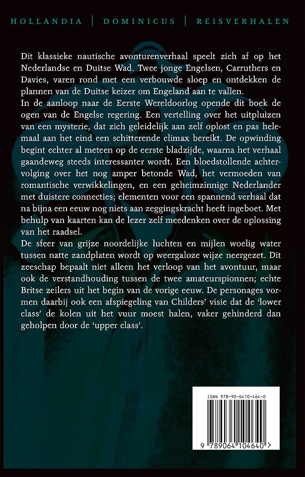 Een vertelling over het uitpluizen van een mysterie, dat zich geleidelijk aan zelf oplost en pas helemaal aan het eind een schitterende climax bereikt. De opwinding begint echter al meteen op de eerste bladzijde, waarna het verhaal gaandeweg steeds interessanter wordt. Met behulp van kaarten kan de lezer ook zelf meedenken. En wat de hoofdpersonen betreft: echte Britse zeilers uit het begin van de vorige eeuw. De sfeer van grijze noordelijke luchten en kilometers woelig water en natte zandplaten is vrijwel nergens zo goed weergegeven als in dit boek.