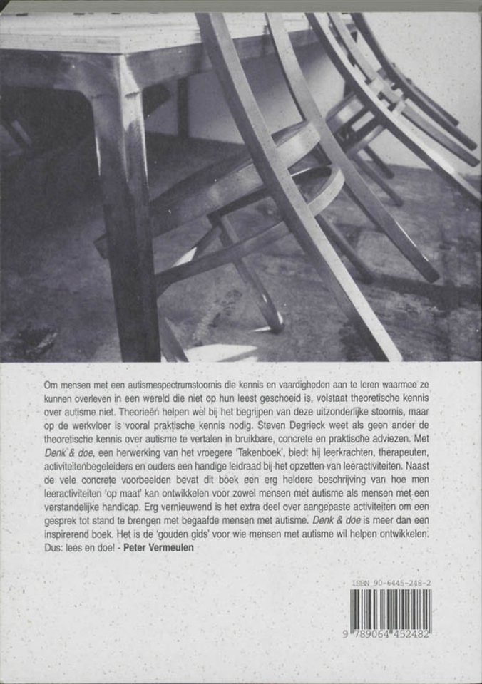 Om mensen met een autismespectrumstoornis die kennis en vaardigheden aan te leren waarmee ze kunnen overleven in een wereld die niet op hun leest geschoeid is, volstaat theoretische kennis over autisme niet. Theorieën helpen wel bij het begrijpen van deze uitzonderlijke stoornis, maar op de werkvloer is vooral praktische kennis nodig. Steven Degrieck weet als geen ander de theoretische kennis over autisme te vertalen in bruikbare, concrete en praktische adviezen. Met Denk & doe, een herwerking van het vroegere 'Takenboek', biedt hij leerkrachten, therapeuten, activiteitenbegeleiders en ouders een handige leidraad bij het opzetten van leeractiviteiten. Naast de vele concrete voorbeelden bevat dit boek een erg heldere beschrijving van hoe men leeractiviteiten 'op maat' kan ontwikkelen voor zowel mensen met autisme als mensen met een verstandelijke handicap. Erg vernieuwend is het extra deel over aangepaste activiteiten om een gesprek tot stand te brengen met begaafde mensen met autisme. Denk & doe is meer dan een inspirerend boek. Het is de 'gouden gids' voor wie mensen met autisme wil helpen ontwikkelen. Dus: lees en doe! - Peter Vermeulen