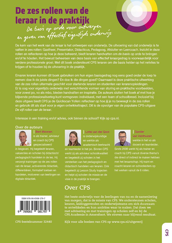 Ervaren leraren kunnen dit boek gebruiken om hun eigen basisgedrag nog eens goed onder de loep te nemen: doe ik de juiste dingen? En doe ik die dingen goed? Daarnaast is deze praktische uitwerking van de zes rollen uitermate geschikt voor startende leraren en studenten van lerarenopleidingen. Er is oog voor eigentijds onderwijs met verschillende vormen van sturing en praktische voorbeelden, voor zowel po, vo als mbo, bieden handvatten en inspiratie. De auteurs sluiten het boek af met hoe je blijvende professionalisering kunt vormgeven: individueel, met een team of schoolbreed. Inclusief bij deze uitgave biedt CPS je de Quickscan Yollen: reflecteer op hoe jij je nu beweegt in de zes rollen en gebruik dit als start voor je eigen ontwikkeltraject. Dit is de opvolger van de populaire CPS-uitgave De vijf rollen van de leraar.
