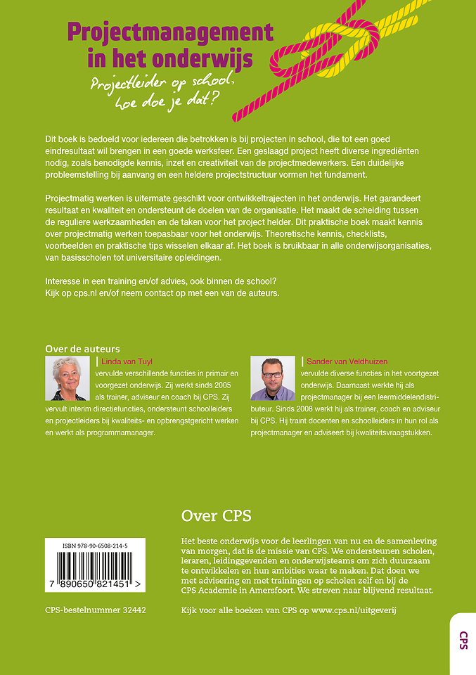 Dit boek is bedoeld voor iedereen die betrokken is bij projecten in school, die tot een goed eindresultaat wil brengen in een goede werksfeer. Een geslaagd project heeft diverse ingrediënten nodig, zoals benodigde kennis, inzet en creativiteit van de projectmedewerkers. Een duidelijke probleemstelling bij aanvang en een heldere projectstructuur vormen het fundament.