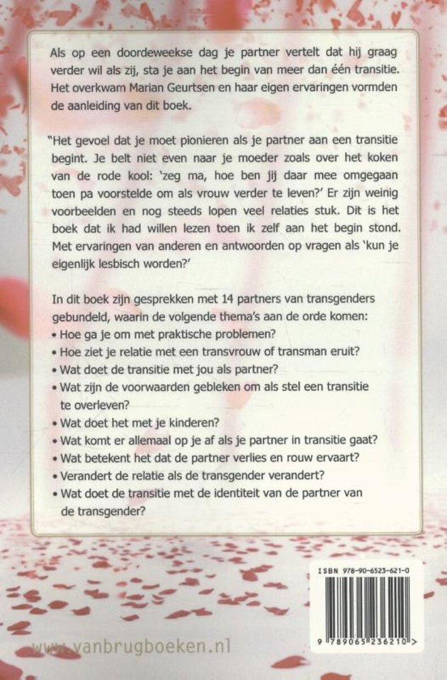 "Het gevoel dat je moet pionieren als je partner aan een transitie begint. Je belt niet even naar je moeder zoals over het koken van de rode kool: 'zeg ma, hoe ben jij daar mee omgegaan toen pa voorstelde om als vrouw verder te leven?' Er zijn weinig voorbeelden en nog steeds lopen veel relaties stuk. Dit is het boek dat ik had willen lezen toen ik zelf aan het begin stond. Met ervaringen van anderen en antwoorden op vragen als 'kun je eigenlijk lesbisch worden?'