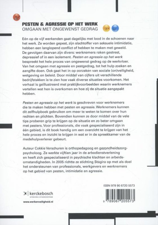 Iedere dag slepen zo'n 50.000 mensen zich met lood in hun schoenen naar het werk. Ze worden gepest, zijn slachtoffer van seksuele intimidatie, hebben een langlopend conflict of hebben te maken met geweld. De gevolgen daarvan zijn divers: werknemers raken gestrest, depressief of in een isolement. Pesten en agressie op het werk bespreekt het hele proces van ongewenst gedrag op de werkvloer. Van het omgaan met agressie en pestgedrag, tot het hulp zoeken en aangifte doen. Ook gaat het in op oorzaken van sociale (on)veiligheid, wetgeving en beleid. Door middel van cijfers uit verschillende bedrijfstakken is te zien hoe vaak diverse situaties voorkomen. Het verhaal is geïllustreerd met praktijkvoorbeelden waarin werknemers vertellen wat hen is overkomen en hoe zij de situatie aangepakt hebben.