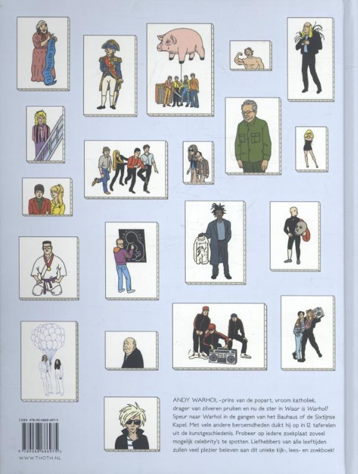 Als Andy Warhol door de tijd had kunnen reizen, waar was hij dan naartoe gegaan? Om daar achter te komen krijgt hij in Waar is Warhol? zijn eigen tijdmachine... Ga met Andy mee en maak een reis door de geschiedenis van de kunst. Hij duikt op in twaalf iconische momenten uit de kunstgeschiedenis, van Michelangelo in de Sixtijnse Kapel tot Jean-Michel Basquiat in de straten van New York, van de Franse impressionisten in Trouville tot de Duitse modernisten in het Bauhaus. Aan de lezer de taak hem tussen de andere aanwezigen op te sporen. Al speurend naar Andy zal de lezer tussen de menigte talrijke bekende historische figuren en kunstwerken uit de betreffende periode herkennen.