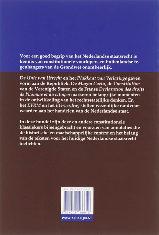 In deze bundel zijn deze en andere constitutionele klassiekers bijeengebracht en voorzien van annotaties die de historische en maatschappelijke context en het belang van de teksten voor het huidige Nederlandse staatsrecht toelichten.