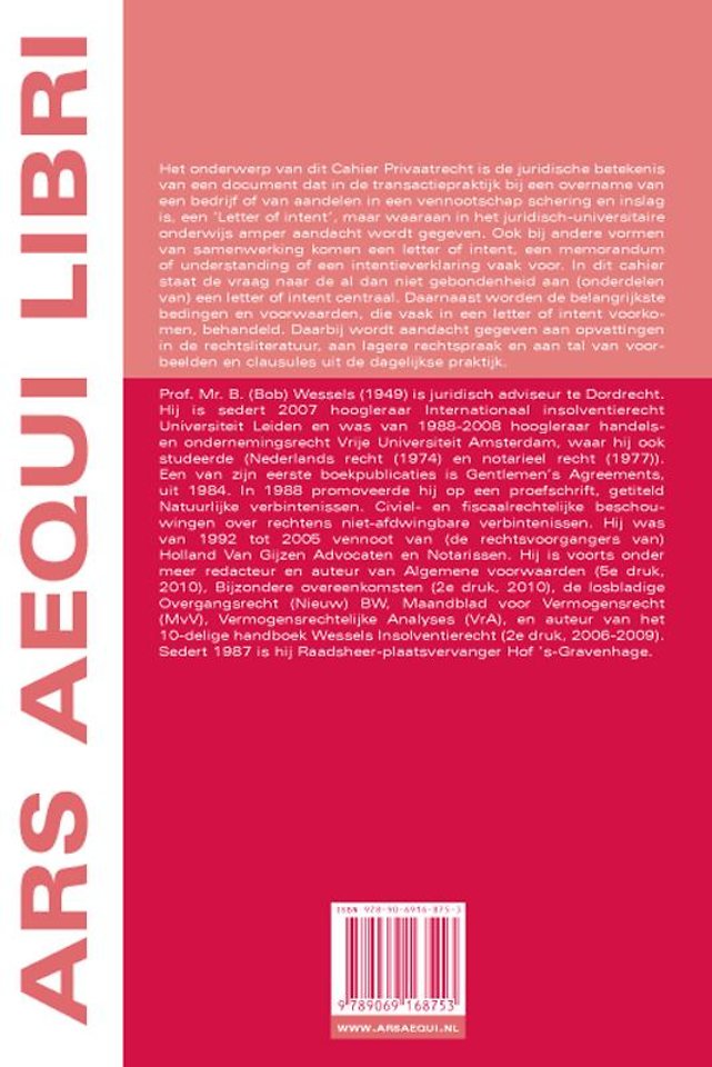 Het onderwerp van dit Cahier Privaatrecht is de juridische betekenis van een document dat in de transactiepraktijk bij een overname van een bedrijf of van aandelen in een vennootschap schering en inslag is, een 'Letter of intent', maar waaraan in het juridisch-universitaire onderwijs amper aandacht wordt gegeven. Ook bij andere vormen van samenwerking komen een letter of intent, een memorandum of understanding of een intentieverklaring vaak voor.