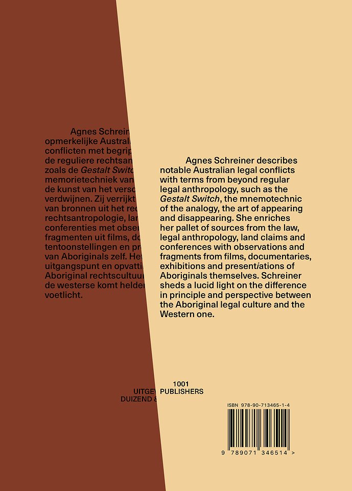 Agnes Schreiner beschrijft opmerkelijke Australische rechtsconflicten met begrippen van buiten de reguliere rechtsantropologie, zoals de Gestalt Switch, de memorietechniek van de analogie, de kunst van het verschijnen en verdwijnen. Zij verrijkt haar palet van bronnen uit het recht, de rechtsantropologie, landclaims en conferenties met observaties en fragmenten uit films, documentaires, tentoonstellingen en presentiaties van Aboriginals zelf.