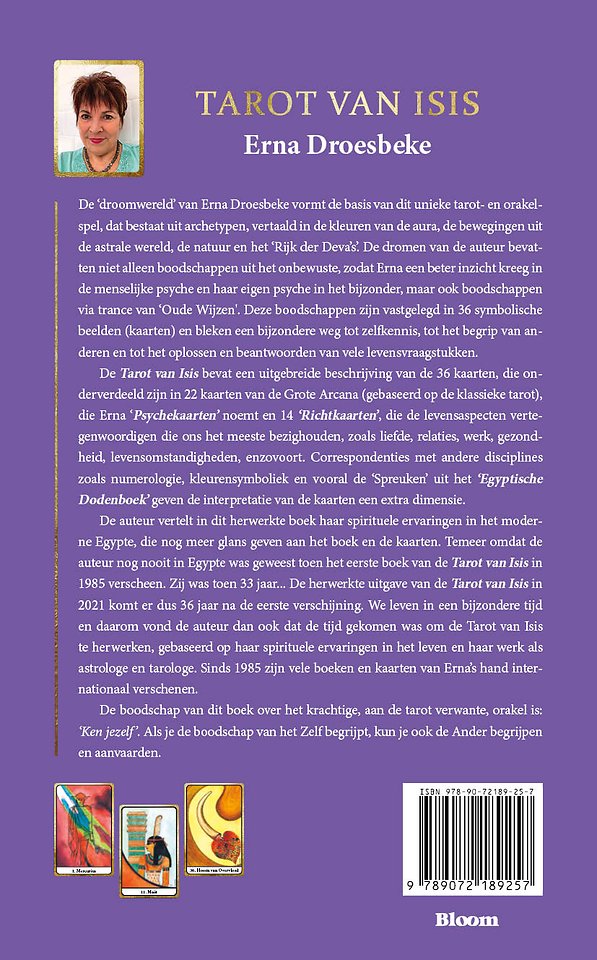 De auteur vertelt in dit herwerkte boek haar spirituele ervaringen in het moderne Egypte, die nog meer glans geven aan het boek en de kaarten. Temeer omdat de auteur nog nooit in Egypte was geweest toen het eerste boek van de Tarot van Isis in 1985 verscheen. Zij was toen 33 jaar... De herwerkte uitgave van de Tarot van Isis in 2021 komt er dus 36 jaar na de eerste verschijning. We leven in een bijzondere tijd en daarom vond de auteur dan ook dat de tijd gekomen was om de Tarot van Isis te herwerken, gebaseerd op haar spirituele ervaringen in het leven en haar werk als astrologe en tarologe. Sinds 1985 zijn vele boeken en kaarten van Erna’s hand internationaal verschenen.