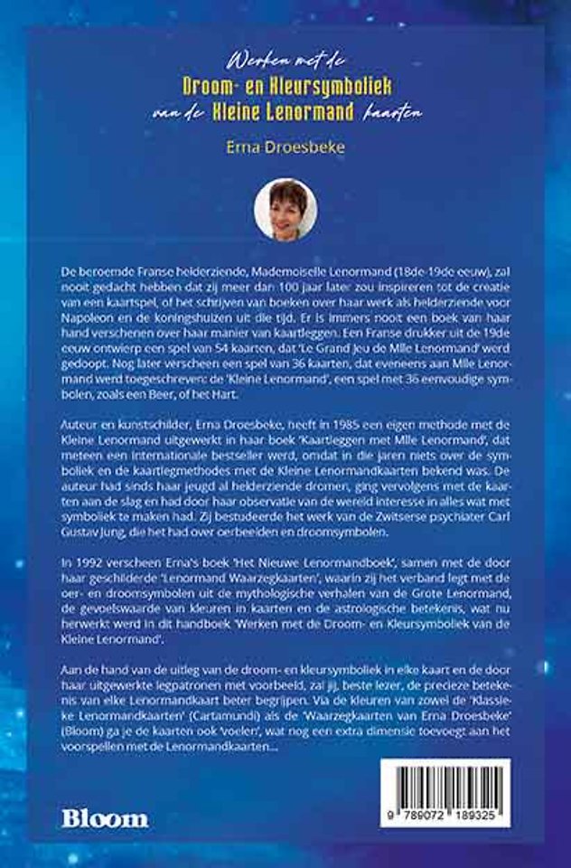 Erna Droesbeke herwerkte ‘Het Nieuwe Lenormandboek’ in het huidige ‘Werken met de Droom- en Kleursymboliek van de Kleine Lenormandkaarten’, waarin zij nog dieper ingaat op de droom- en kleurensymboliek, verband legt met de symboliek van de twaalf astrologische tekens. Aan de hand van de uitleg over droom- en kaartsymboliek in elke kaart en de eenvoudige methodes met voorbeeld ga je beter begrijpen wat elke Lenormandkaart wil zeggen. Met de betekenis van de kleuren ga je de kaarten ook ‘voelen’ wat nog een diepere dimensie geeft aan het voorspellen met de Lenormandkaarten…