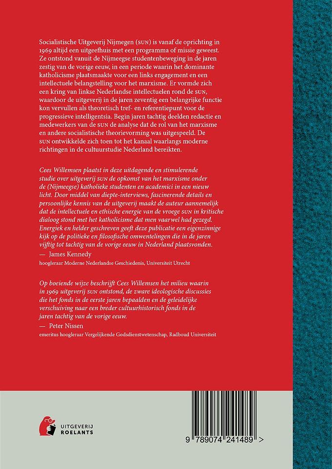 Het boek van Cees Willemsen is een diepgaande intellectueel-historische studie van de ontwikkeling van het katholieke intellectuele milieu rond de Katholieke Universiteit Nijmegen en van de vooral Brabantse milieus waaruit de student-oprichters van uitgeverij SUN voortkwamen. Hij laat zien hoe bewegingen binnen het katholicisme in deze milieus in de jaren 1930-1950 leidden tot een omvorming van katholiek engagement naar een sociaal engagement dat in bepaalde interpretaties van het marxisme een nieuwe belofte en uiting vond. Hij situeert de totstandkoming van de SUN, het programma van de uitgeverij en de intellectuele discussies rond de uitgaven in dit kader. Het boek richt zich daarom vooral op de periode tot 1983, waarin die discussie rond en vanuit het marxisme het programma en de identiteit van de uitgeverij beheerste. De op zich nog steeds belangrijke periode van de SUN als uitgeverij van Frans georiënteerde cultuurhistorische werken, architectuur(geschiedenis) en diverse educatieve publicaties komt aan de orde in de slothoofdstukken van de dissertatie. (Remieg Aerts)