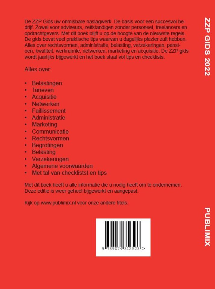 De ZZP Gids uw onmisbare naslagwerk. De basis voor een succesvol bedrijf. Zowel voor adviseurs, zelfstandigen zonder personeel, freelancers en opdrachtgevers. Met dit boek blijft u op de hoogte van de nieuwste regels. De gids bevat veel praktische tips waarvan u dagelijks plezier zult hebben. Alles over rechtsvormen, administratie, belasting, verzekeringen, pensioen, kwaliteit, werkruimte, netwerken, marketing en acquisitie. De ZZP gids wordt jaarlijks bijgewerkt en het boek staat vol tips en checklists.