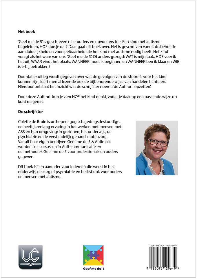 Het boek 'Geef me de 5' is geschreven naar ouders en opvoeders toe. Een kind met autisme opvoeden en begeleiden, HOE doe je dat? Daar gaat dit boek over. Het is geschreven vanuit de behoefte aan duidelijkheid en voorspelbaarheid die het kind met autisme nodig heeft. Het kind vraagt als het ware van ons: "Geef me de 5". Of anders gezegd: WAT is mijn taak, HOE voer ik hem uit, WAAR vindt het plaats, WANNEER moet ik het doen en WIE is erbij betrokken?