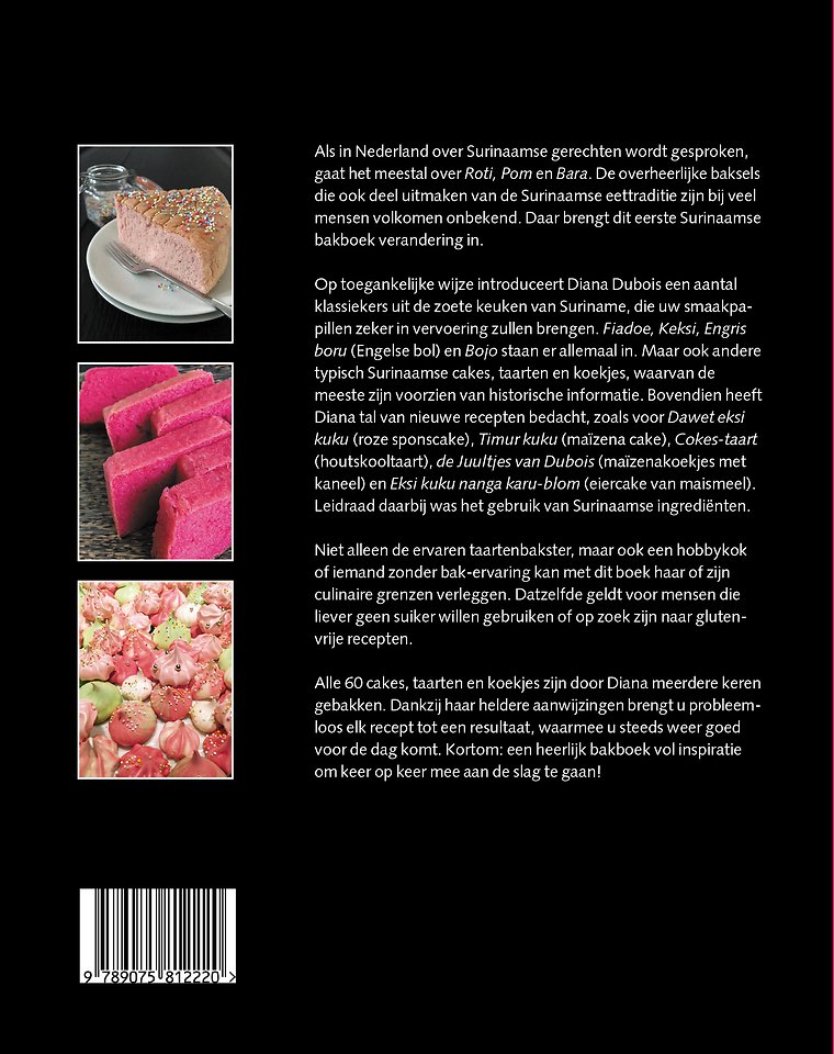 Op toegankelijke wijze introduceert Diana Dubois een aantal klassiekers uit de zoete keuken van Suriname, die uw smaakpapillen zeker in vervoering zullen brengen. Fiadoe, Keksi, Ingris boru (Engelse bol) en Bojo staan er allemaal in. Maar ook andere typisch Surinaamse cakes, taarten en koekjes, waarvan de meeste zijn voorzien van historische informatie. Bovendien heeft Diana tal van nieuwe recepten bedacht, zoals voor Dawet eksi kuku (roze sponscake), Timur kuku (maïzena cake), Cokes-taart (houtskooltaart), de Juultjes van Dubois (maïzenakoekjes met kaneel) en Eksi kuku nanga karu-blom (eiercake van maismeel). Leidraad daarbij was het gebruik van Surinaamse ingrediënten.
