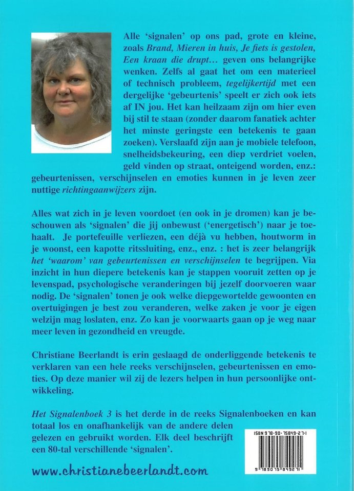 Alles wat zich in je leven voordoet (en ook in je dromen) kan je beschouwen als 'signalen' die jij onbewust ('energetisch') naar je toehaalt. Je portefeuille verliezen, een déjà vu hebben, houtworm in je woonst, een kapotte ritssluiting, enz., enz.: het is zeer belangrijk het 'waarom' van gebeurtenissen en verschijnselen te begrijpen. Via inzicht in hun diepere betekenis kan je stappen vooruit zetten op je levenspad, psychologische veranderingen bij jezelf doorvoeren waar nodig. De 'signalen' tonen je ook welke diepgewortelde gewoonten en overtuigingen je best zou veranderen, welke zaken je voor je eigen welzijn mag loslaten, enz. Zo kan je voorwaarts gaan op je weg naar meer leven in gezondheid en vreugde.