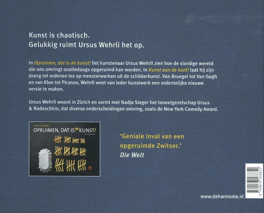 In Nederland had nog niemand van de Zwitser Ursus Wehrli gehoord toen er in het Duiste taalgebied al 700.000 boeken van zijn hand de toonbank over waren gegaan. Maar algauw na de introductie van Opruimen, dat is de kunst! (4e druk) maakte hij ook in Nederland naam met zijn eigenzinnige manier van ordenen. Wehrli liet ons zien hoe we de slordige wereld die ons omringt eindelijk konden opruimen.In deel twee, Kunst aan de kant!, laat hij zijn drang tot ordenen los op meesterwerken uit de schilderkunst. Van Brueghel tot Van Gogh en van Klee tot Picasso, Wehrli weet van ieder kunstwerk een ordentelijke nieuwe versie te maken.