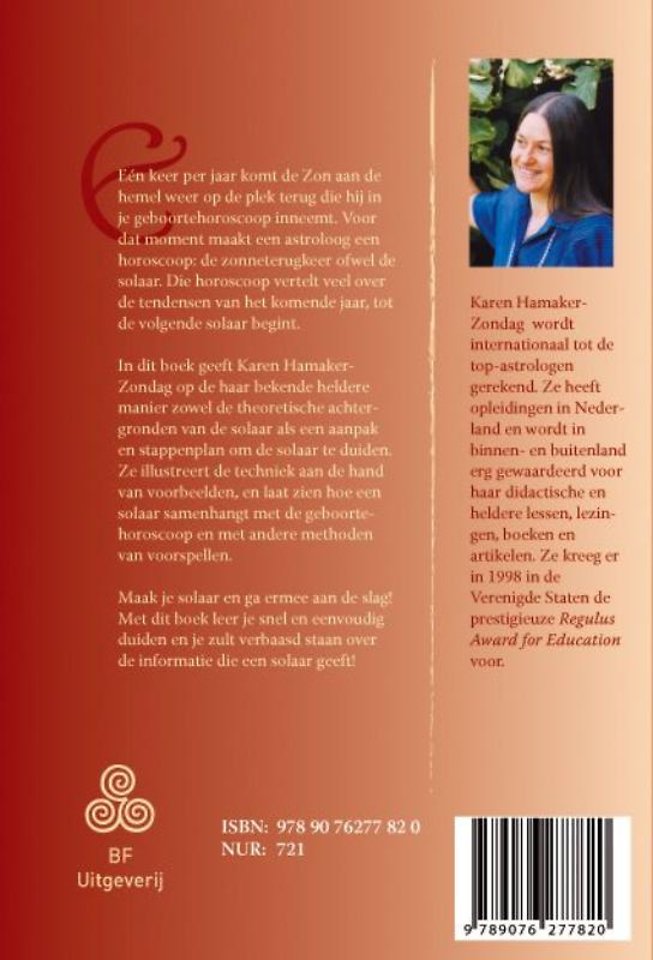 In dit boek geeft Karen Hamaker-Zondag op de haar bekende heldere manier zowel de theoretische achtergronden van de solaar als een aanpak en stappenplan om de solaar te duiden. Ze illustreert de techniek aan de hand van voorbeelden, en laat zien hoe een solaar samenhangt met de geboortehoroscoop en met andere methoden van voorspellen en een prachtig instrument is om diepte te geven aan transits en progressies.