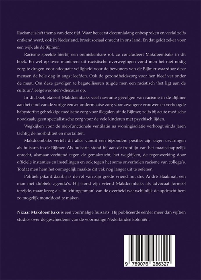 Makdoembaks vertelt dit alles vanuit een bijzondere positie: zijn eigen ervaringen als huisarts in de Bijlmer. Als huisarts stond hij aan de frontlijn van het maatschappelijk onrecht, alsmaar vechtend tegen de gemakzucht, het wegkijken, de tegenwerking door officiële instanties en instellingen en ook tegen het soms onverholen racisme van collega’s. Totdat men hem het onmogelijk maakte dit vak nog langer uit te oefenen.