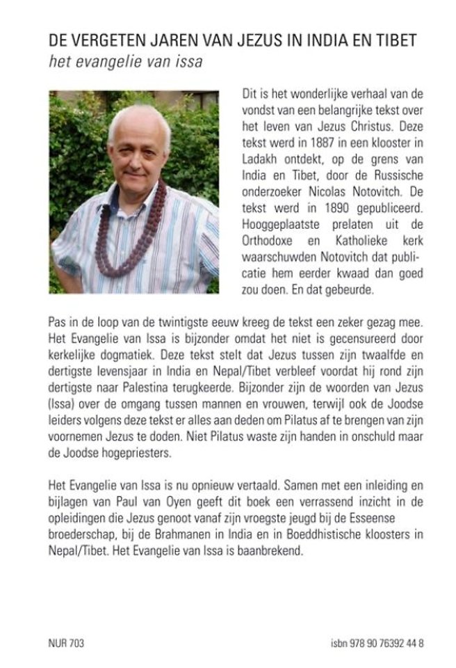 Het Evangelie van Issa is nu opnieuw vertaald. Samen met een inleiding en bijlagen van Paul van Oyen geeft dit boek een verrassend inzicht in de opleidingen die Jezus genoot vanaf zijn vroegste jeugd bij de Esseense broederschap, bij de Brahmanen in India en in Boeddhistische kloosters in