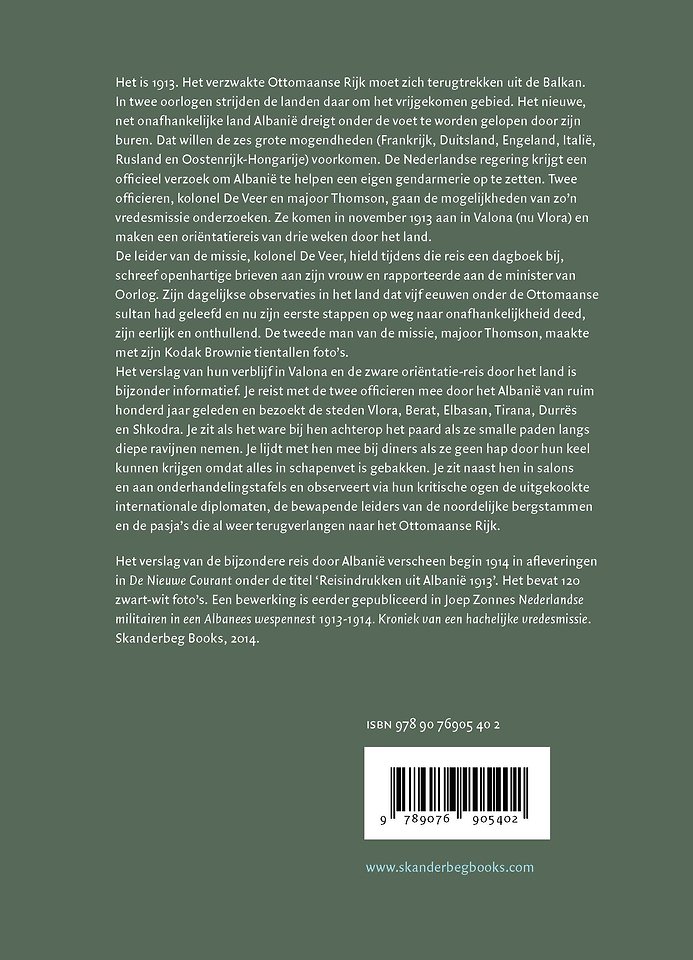 Het is 1913. Het verzwakte Ottomaanse Rijk moet zich terugtrekken uit de Balkan. In twee oorlo-gen strijden de landen daar om het vrijgekomen gebied. Het nieuwe, net onafhankelijke land Al-banië dreigt onder de voet te worden gelopen door zijn buren. Dat willen de zes grote mogendhe-den (Frankrijk, Duitsland, Engeland, Italië, Rusland en Oostenrijk-Hongarije) voorkomen. De Ne-derlandse regering krijgt een officieel verzoek om Albanië te helpen een eigen gendarmerie op te zetten. Twee officieren, kolonel De Veer en majoor Thomson, gaan de mogelijkheden van zo’n vredesmissie onderzoeken. Ze komen in november 1913 aan in Valona (nu Vlora) en maken een oriëntatiereis van drie weken door het land.