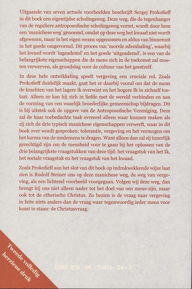 Indringende beschouwing over een van de dringendste vraagstukken van onze tijd, vanuit de geesteswetenschap bezien. Aan de hand van zeven eigentijdse voorbeelden beschrijft Sergej Prokofieff in dit boek een moderne weg tot vergeving, als complement van de gangbare antroposofische scholingsweg. Daarbij laat hij zien hoe vergeving ons dichter bij de etherische Christus brengt. Zo blijkt in de vraag naar vergeving de vraag tot uitdrukking te komen, waar elke mens tegenwoordig voor komt te staan: de Christusvraag. Op deze weg is Rudolf Steiner ons op indrukwekkende wijze voorgegaan. Wil de Antroposofische Vereniging het haar gestelde doel verwerkelijken, dan zal ook zij deze weg moeten gaan.