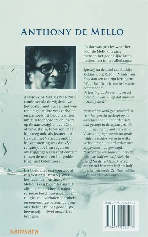 Dit boek. met een voorwoord van WILLIAM DYCH S.J. over het leven van Anthony de Mello, is een bloemlezing uit zijn boeken en bevat, naast serieuze beschouwingen over religie, veel verhalen, parabels en eenvoudige oefeningen om ons dichter bij het goddelijke, bewustzijn, ofwel onszelf, te brengen.