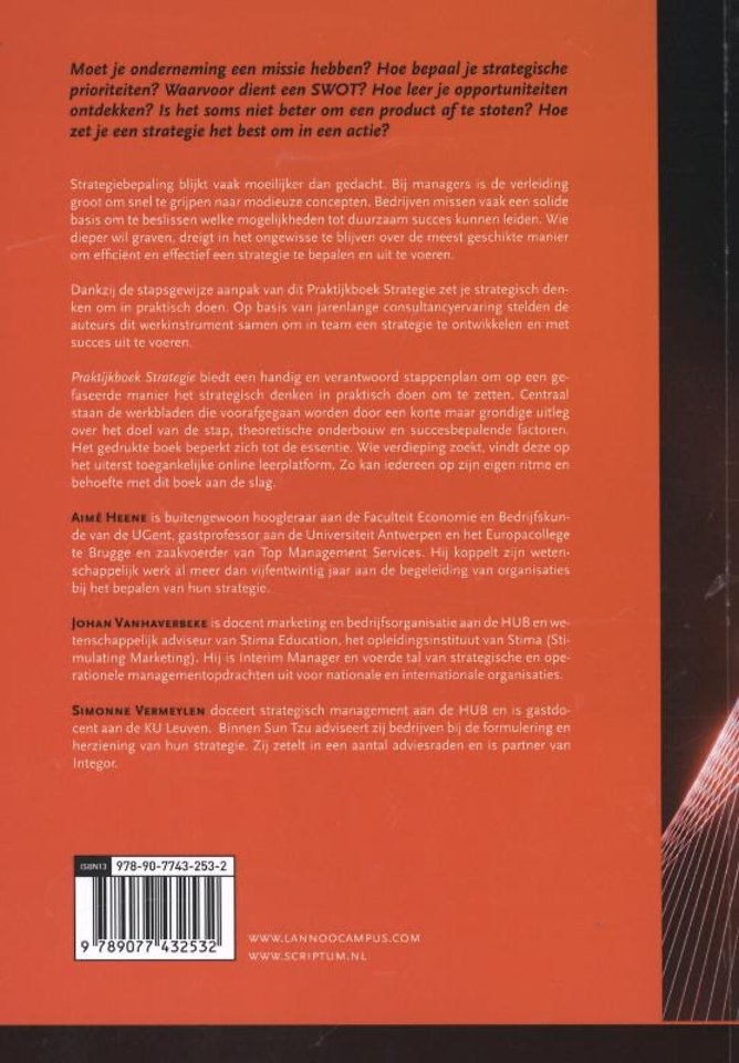 'Praktijkboek Strategie' biedt een handig en verantwoord stappenplan om op een gefaseerde manier het strategisch denken in praktisch doen om te zetten. Centraal staan de werkbladen die voorafgegaan worden door een korte maar grondige uitleg over het doel van de stap, theoretische onderbouw en succesbepalende factoren. Het gedrukte boek beperkt zich tot de essentie. Wie verdieping zoekt, vindt deze op het uiterst toegankelijke online leerplatform. Zo kan iedereen op zijn eigen ritme en behoefte met dit boek aan de slag.