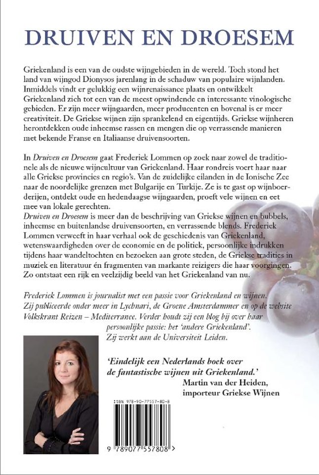 Druiven en Droesem is meer dan de beschrijving van Griekse wijnen en bubbels, inheemse en buitenlandse druivensoorten, en verrassende blends. Frederiek Lommen verweeft in haar verhaal ook de geschiedenis van Griekenland, wetenswaardigheden over de economie en de politiek, persoonlijke indrukken tijdens haar wandeltochten en bezoeken aan grote steden, de Griekse tradities in muziek en literatuur én fragmenten van markante reizigers die haar voorgingen. Zo ontstaat een rijk en veelzijdig beeld van het Griekenland van nu.