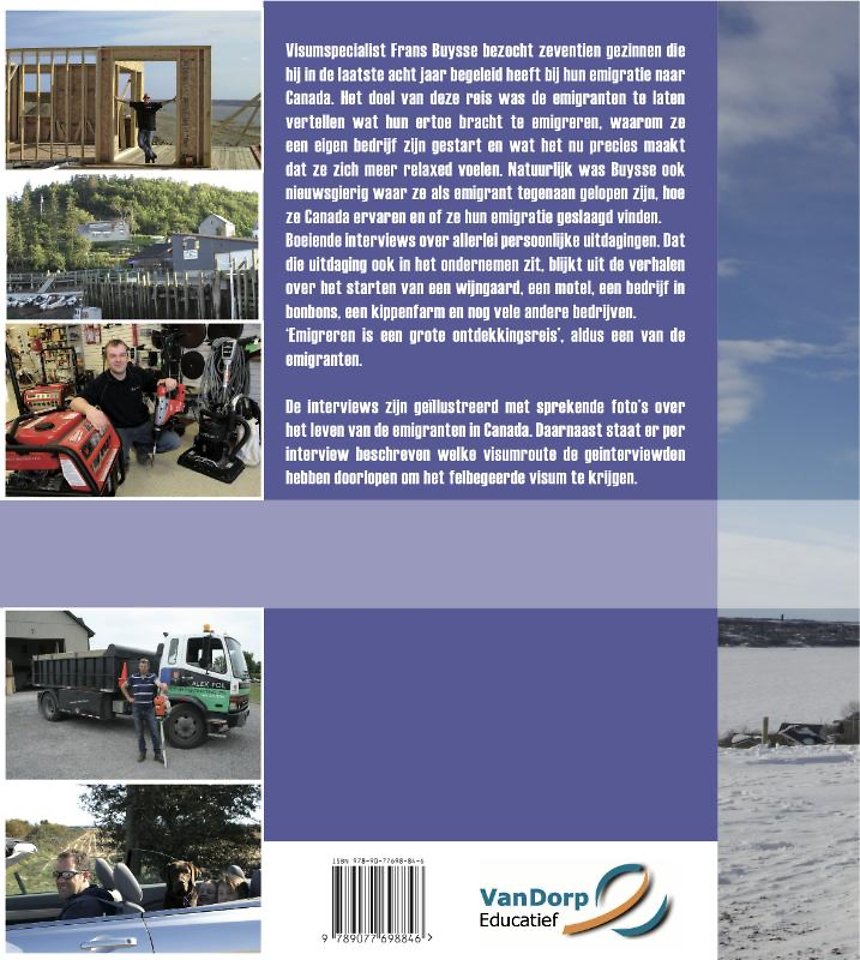 Visumspecialist Frans Buysse bezocht zeventien gezinnen die hij in de laatste acht jaar begeleid heeft bij hun emigratie naar Canada. Het doel van deze reis was de emigranten te laten vertellen wat hun ertoe bracht te emigreren, waarom ze een eigen bedrijf zijn gestart en wat het nu precies maakt dat ze zich meer relaxed voelen. Natuurlijk was Buysse ook nieuwsgierig waar ze als emigrant tegenaan gelopen zijn, hoe ze Canada ervaren en of ze hun emigratie geslaagd vinden. Boeiende interviews over allerlei persoonlijke uitdagingen. Dat die uitdaging ook in het ondernemen zit, blijkt uit de verhalen over het starten van een wijngaard, een motel, een bedrijf in bonbons, een kippenfarm en nog vele andere bedrijven. Emigreren is een grote ontdekkingsreis, aldus een van de emigranten.