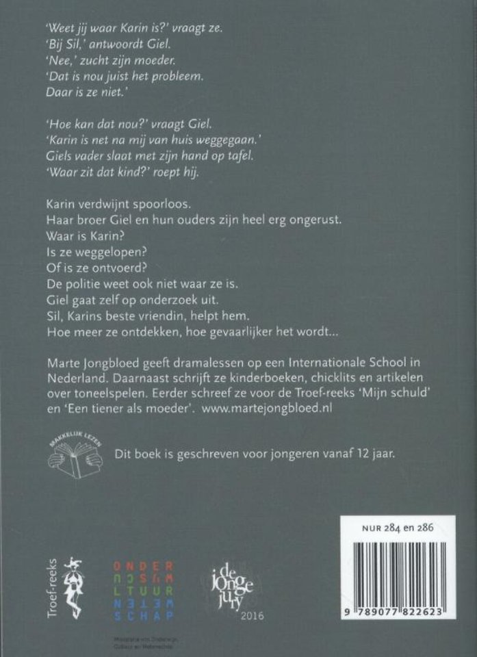 Marte Jongbloed geeft dramalessen op een Internationale School in Nederland. Daarnaast schrijft ze kinderboeken, checklits, en artikelen over toneelspelen. Eerder schreef ze voor de Troef-reeks 'Mijn schuld' en 'Een tiener als moeder'. April 2015 verschijnt van haar 'Kiezen in de oorlog' www.martejongbloed.nl