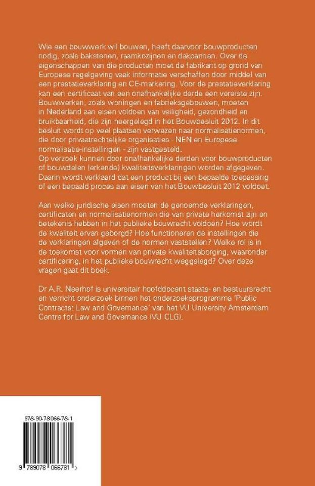 Aan welke juridische eisen moeten de genoemde verklaringen, certificaten en normalisatienormen die van private herkomst zijn en betekenis hebben in het publieke bouwrecht voldoen? Hoe wordt de kwaliteit ervan geborgd? Hoe functioneren de instellingen die de verklaringen afgeven of de normen vaststellen? Welke rol is in de toekomst voor vormen van private kwaliteitsborging, waaronder certificering, in het publieke bouwrecht weggelegd? Over deze vragen gaat dit boek.